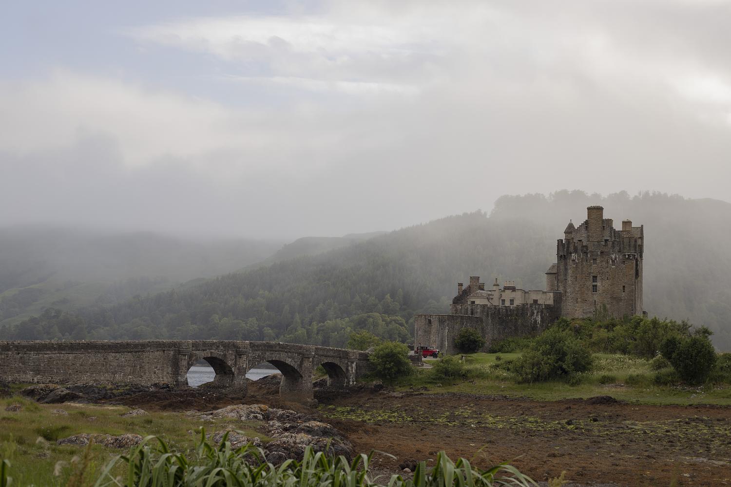 Eilean Donan Castle on a foggy summer day. If you look closely there's a red wedding car.