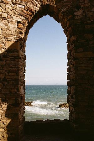 An old archway (Lady’s Tower, Ruby Bay) looking over to the rough seas. This was taken in June 2025 and shot on Kodak Gold 200 film.